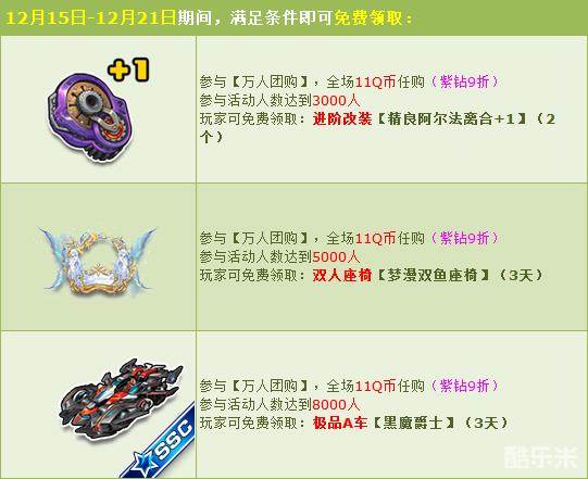 12月15日-12月21日期间,万人团购惊喜开启,玩家在【商城狂欢-万人团购】,全场所有商品11Q币任购(紫钻更有9折优惠)!当参与玩家达到一定人数时,还可免费领取极品道具哦!