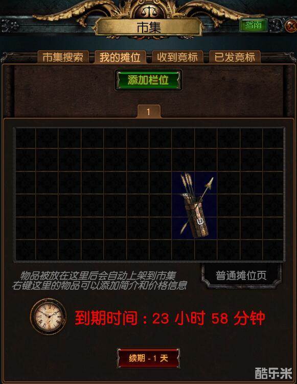 我们打开市集后,就可以在我的摊位中选择出售。但要注意的是,添加栏位是需要点券的,2000点券拥有72个格子,值得注意的是这是格子,并不是,所以如果出售东西较多的话,还是要注意物品的摆放位置的。市集栏位并不是永久的,2000点券持续24小时,价格还是比较昂贵的,所以不建议玩家出售不值钱的物品或者比较少的时候开启栏位。