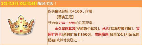 12月11日-1月16日期间,购【角色经验卡+100】,赠送尊贵王冠,有机会得永久皇族套装【圣雅爵尘套装】、永久【深海梦境羽翼】、实用扩充卡【道具扩充卡1600】、贵族精选【钻皇宝石】/【后花园钥匙】或其他奖励之一!其中核心奖励期限型概率为4%-6%,核心奖励永久型概率为2%-4%,非核心奖励概率为90%-94%。