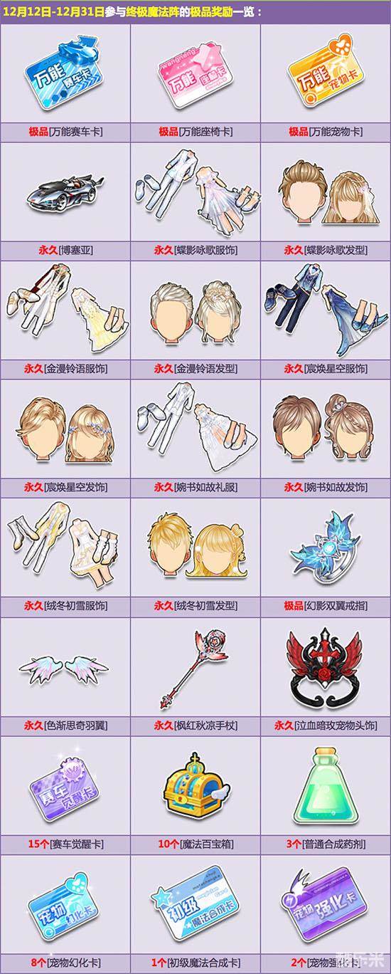 12月12日-12月31日期间,终极魔法阵冬季奖励再更新,一大波极品套装、永久T1机甲、永久A车、极品宠物等你来抢,千万不要错过哦!