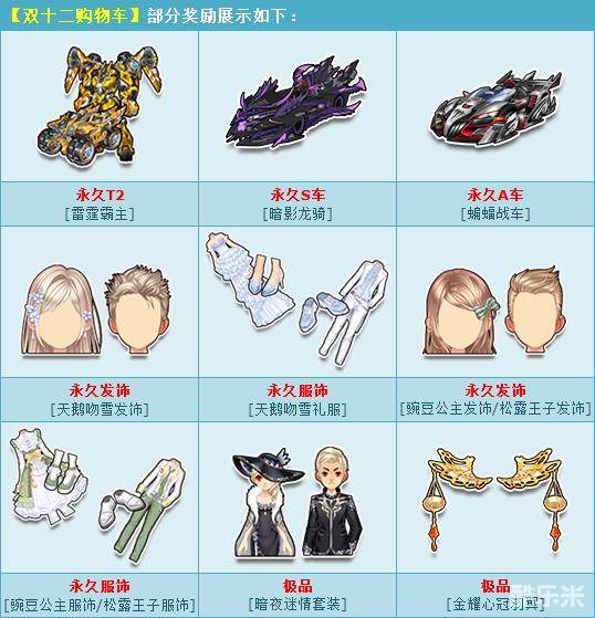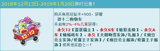 2018年12月13日-2019年1月20日购买角色经验卡+900,获赠:双十二购物车,开启有几率获得:永久T2【雷霆霸主】、永久S车【暗影龙骑】、永久A车【蝙蝠战车】、永久【天鹅吻雪发饰/礼服】/【豌豆公主发饰/松露王子发饰】/【豌豆公主服饰/松露王子服饰】或其他奖励之一!获得核心奖励永久型概率是:2%-4%,获得核心奖励期限型概率是:4%-6%,获得非核心奖励概率是:90%-94%。