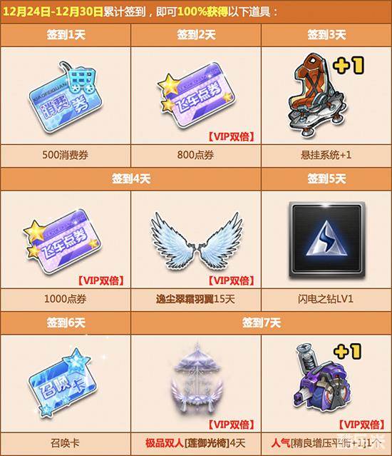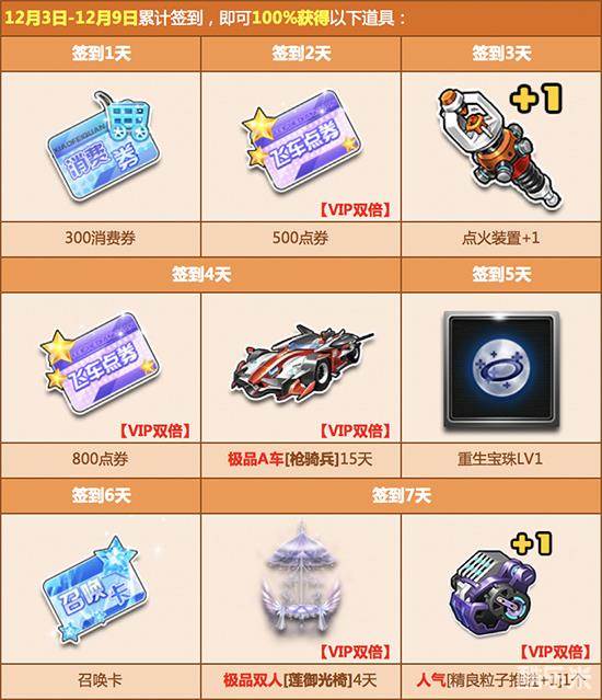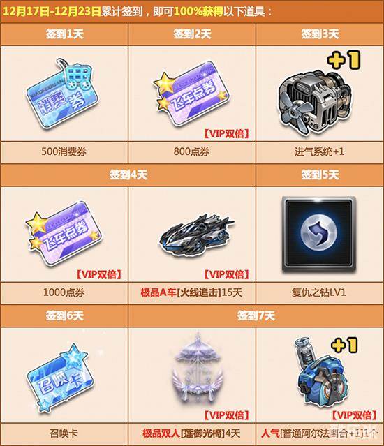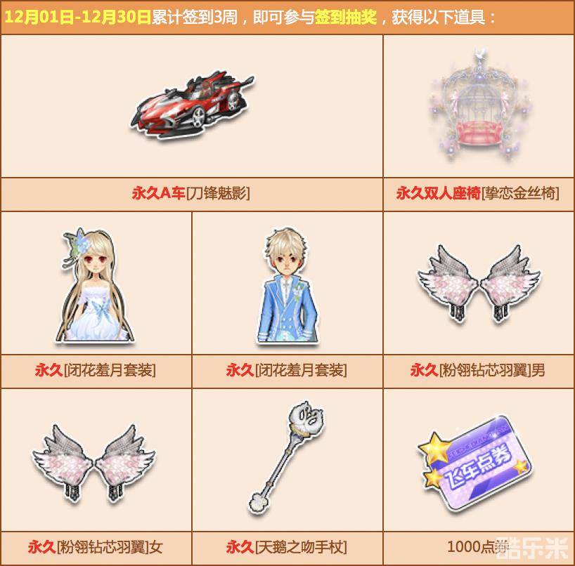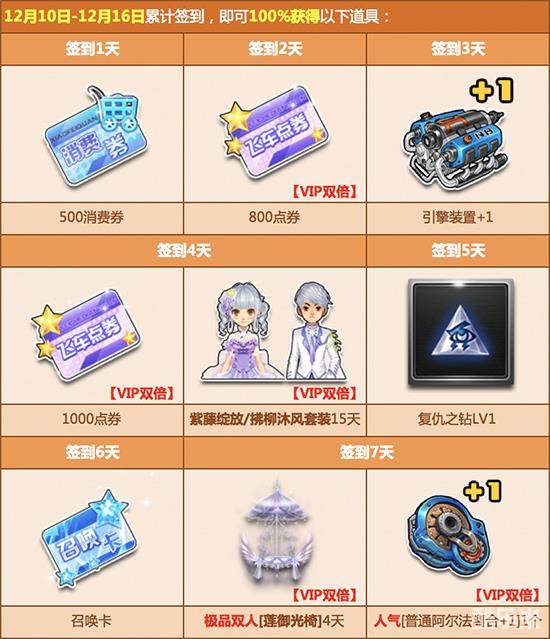 12月1日起,每天登录游戏完成签到任务,即可获得丰厚的点券奖励,最高可领16000点券。还有人气道具、极品A车和双人座椅福利等你来拿!累计签到一周,即可免费领取极品双人座椅【莲御光椅】、极品A车【火线追击】/【枪骑兵】。累计签到3周,还可以抽取永久A车【刀锋魅影】、永久双人座椅【挚恋金丝椅】、永久套装【闭花羞月套装】等惊喜奖励!
