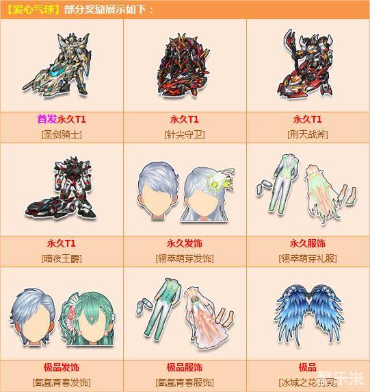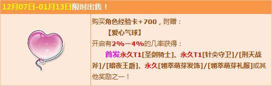 12月7日-1月13日期间,购【角色经验卡+700】,赠送爱心气球,有机会得首发永久T1【圣剑骑士】、永久T1【针尖守卫】/【刑天战斧】/【暗夜王爵】、永久【翎萃萌芽发饰】/【翎萃萌芽礼服】或其他奖励之一!其中核心奖励期限型概率为4%-6%,核心奖励永久型概率为2%-4%,非核心奖励概率为90%-94%。