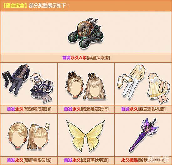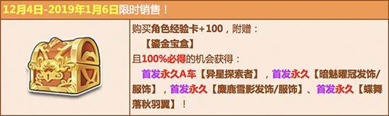 12月4日-2019年1月6日,购买角色经验卡+100,附赠【鎏金宝盒】,可100%获得首发永久A车【异星探索者】,首发永久【暗魅曜冠发饰/服饰】,首发永久【麋鹿雪影发饰/服饰】、首发永久【蝶舞落秋羽翼】或其他奖励!活动规则如下: