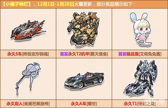12月1日至1月28日,小橘子神灯火爆更新,永久极品S车【终极变形销魂】、首发永久T2【霸天堡垒】、首发极品宠【艾萌兔兔酱】、首发双人座椅【夜阑芭蕉座椅】、极品A车【耀世】、永久T1【侍武之魂】等各式极品倾情回馈,点亮神灯,赢走属于你的超级大礼!