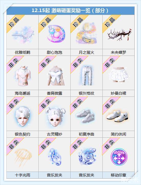 12.15起,激萌砸蛋奖励更新,带着美好愿望的全新双人坐骑-优雅纸鹤,千纸鹤带去我对你的祝愿!还有人气热门座椅返场助力哦-甜心泡泡、月之萤火,给寒冬增添甜蜜的温度。此外,还有全新休闲的情侣服饰哦~