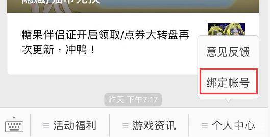 在菜单栏内点击【个人中心 - 绑定帐号】,点击立即绑定即可,绑定后不可解绑与更换哟。