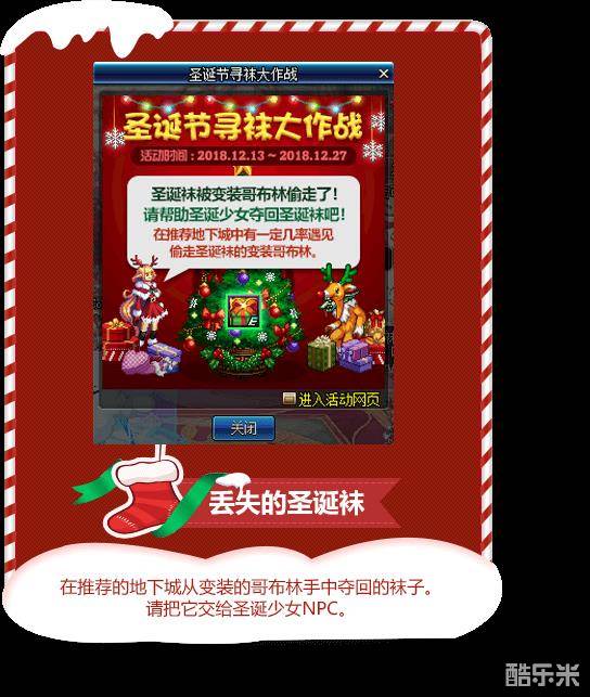 活动期间,LV17级以上的勇士们在推荐地下城会遇到变装哥布林,每日最多可遇到20次。击杀变装哥布林会掉落4个【丢失的圣诞袜】,每日06点重置。