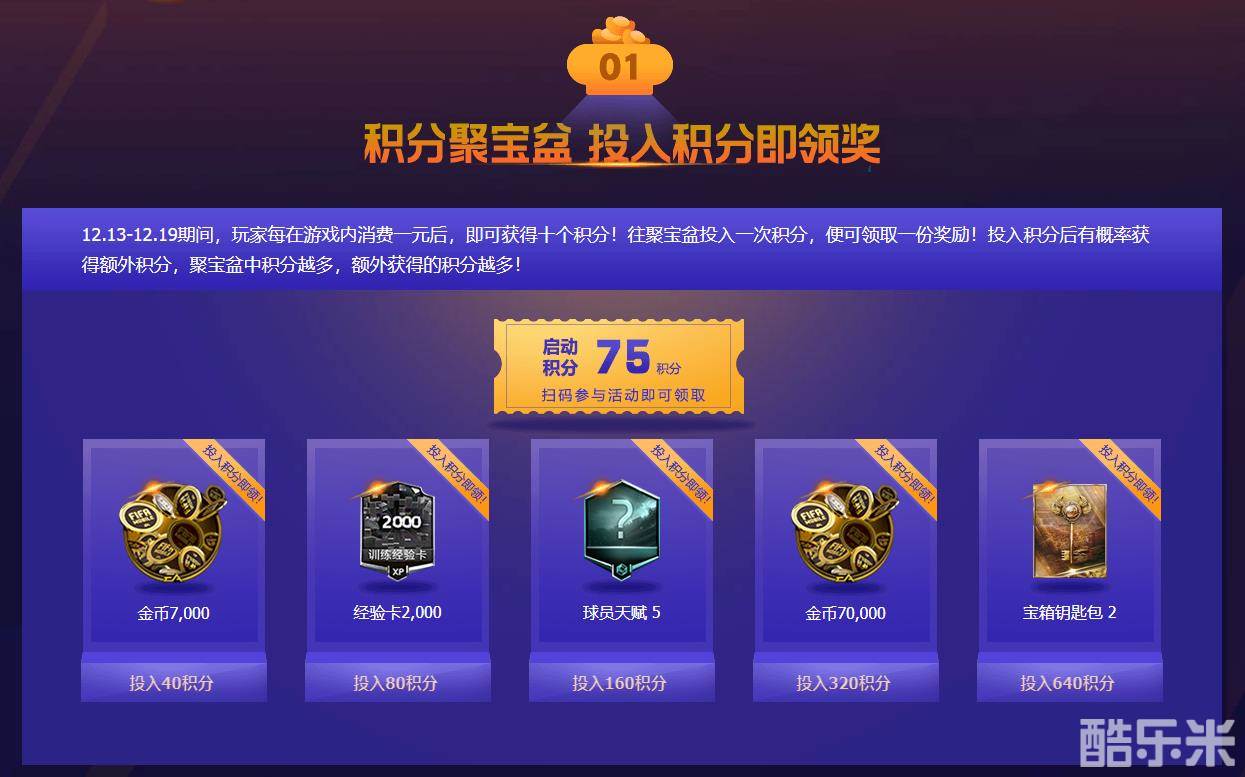 在活动期间(12.13-12.19),玩家扫码参与活动即可领取75积分!玩家每在游戏中充值一元,即可获得十个积分。玩家获得积分后,可投入到聚宝盆中,不仅能获得固定奖励,还可以获得额外积分!投入积分门槛逐次递进,第五档(投入640积分)时最多可以领取10次固定奖励!
