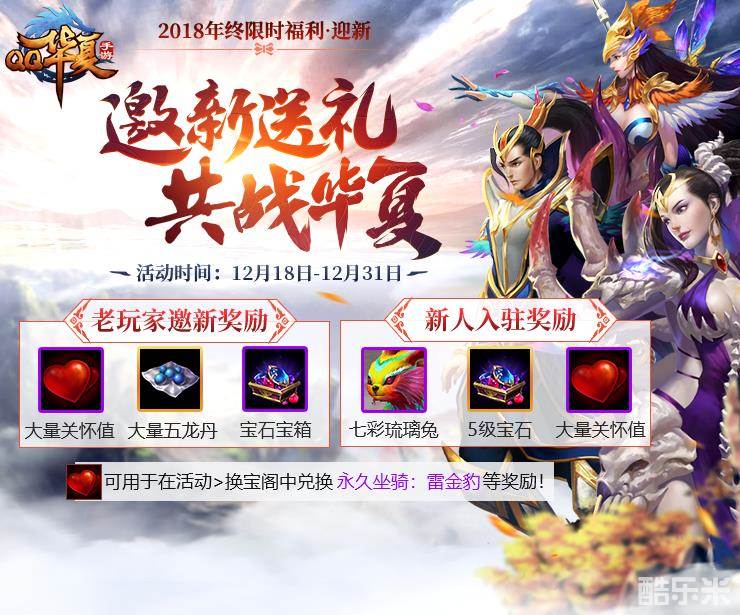 此外,在迎新送礼活动期间内,只要勇士邀请新朋友下载并创建角色,就能够获取超多奖励。宝石宝箱、五龙丹、关怀值都已经为你准备好,更有七彩琉璃兔碎片、5级宝石等稀有奖励等着你抢夺,这个圣诞,给你海量惊喜!