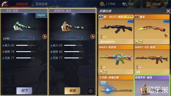 如图 ,手斧-茉莉和同系列、同品质的军用手斧-耀龙相比,前者威力、攻击范围和后者等同,但手持移速略低于后者,即:后者灵活性更强,作战中稍占优势。