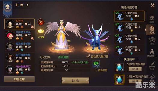 幻化时,通过消耗幸运草,可令幻化达到最好的效果。幻化过程中,可通过左侧的幻兽栏选择主幻兽,通过右侧选择副幻兽,如果副幻兽全部消耗,右下角的快速使用能够直接孵化O型兽。