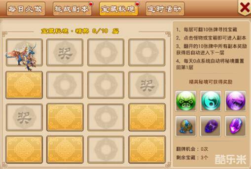 每个难度共10层,每层有固定的6个副本,每层可翻牌10次,每天0点重置回第一层。