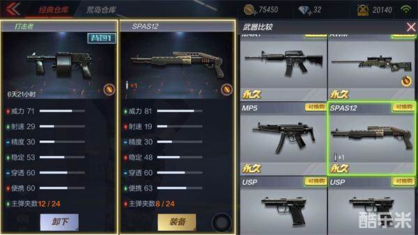 如图,打击者和SPAS12相比,前者射速、稳定、主弹夹数强于后者,威力、便携低于后者,其他数据保持一致,即:打击者具备更强的续航、输出强度,SPAS12则是一击毙命的典型代表。