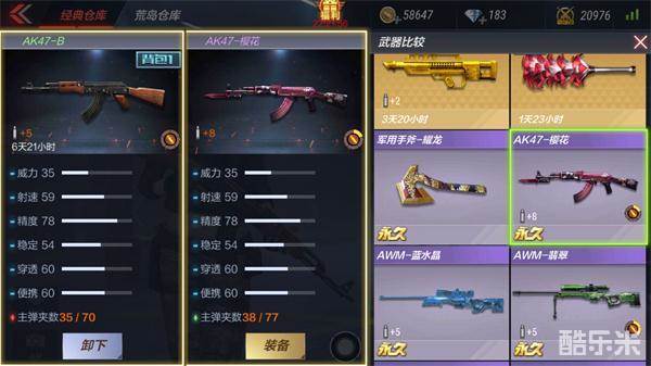 如图,AK47-B和AK47-樱花相比,后者仅在品质和主弹夹数上高于前者,其他无任何区别(或许涂装更靓丽?)。如此,也就代表:两者刚枪更看重技术,而不是属性。