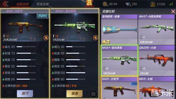 如图,9A91-万圣节和M4A1-琉光茉莉相比,前者在射速、精度和稳定数据上高于后者,威力、稳定性、穿透和主弹夹数低于后者,即:论作战续航和输出伤害,后者占优;论命中精度和压制性,前者占优。