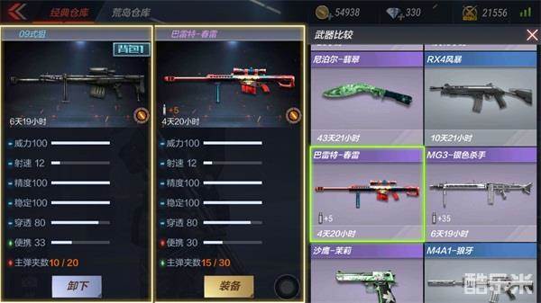 如图,09式狙和巴雷特-春雷相比,前者便携度强于后者、主弹夹数低于后者,其他数据保持一致,即:论执行力,前者占优;论续航时间,后者占优。