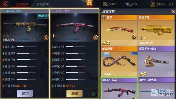 如图,AN94-迷彩和AK47-樱花相比,前者威力、精度、便携和主弹夹数弱于后者,射速强于后者,其他数据保持一致,即:仅从字面数据来看来看,后者全面碾压前者,但凭借可靠的稳定性,前者在某些特定环境下却可发挥后者成倍的作用。