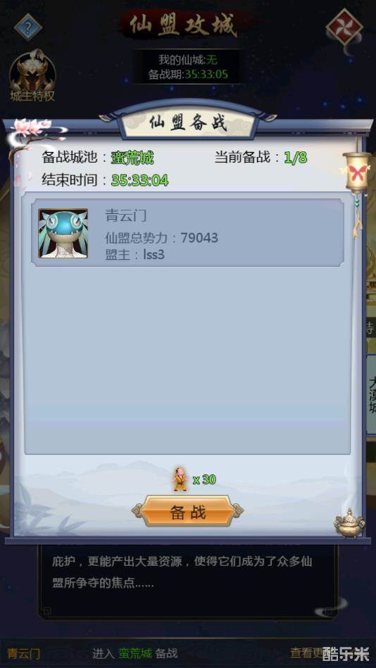 备战期(2天):仙盟盟主选择一座城池,带领仙盟帮众前往备战