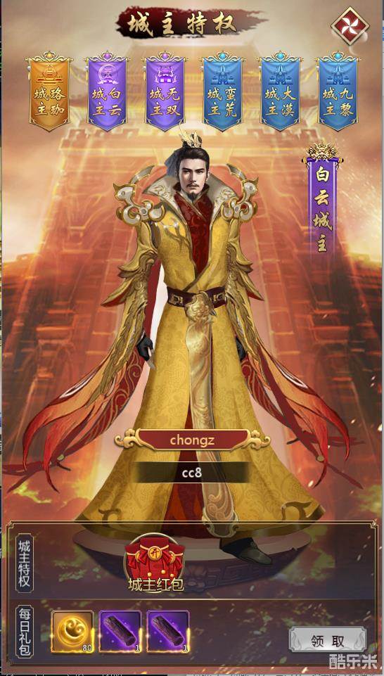 攻城成功的仙盟盟主及帮众,每天都可以在城主特权中领取礼包~