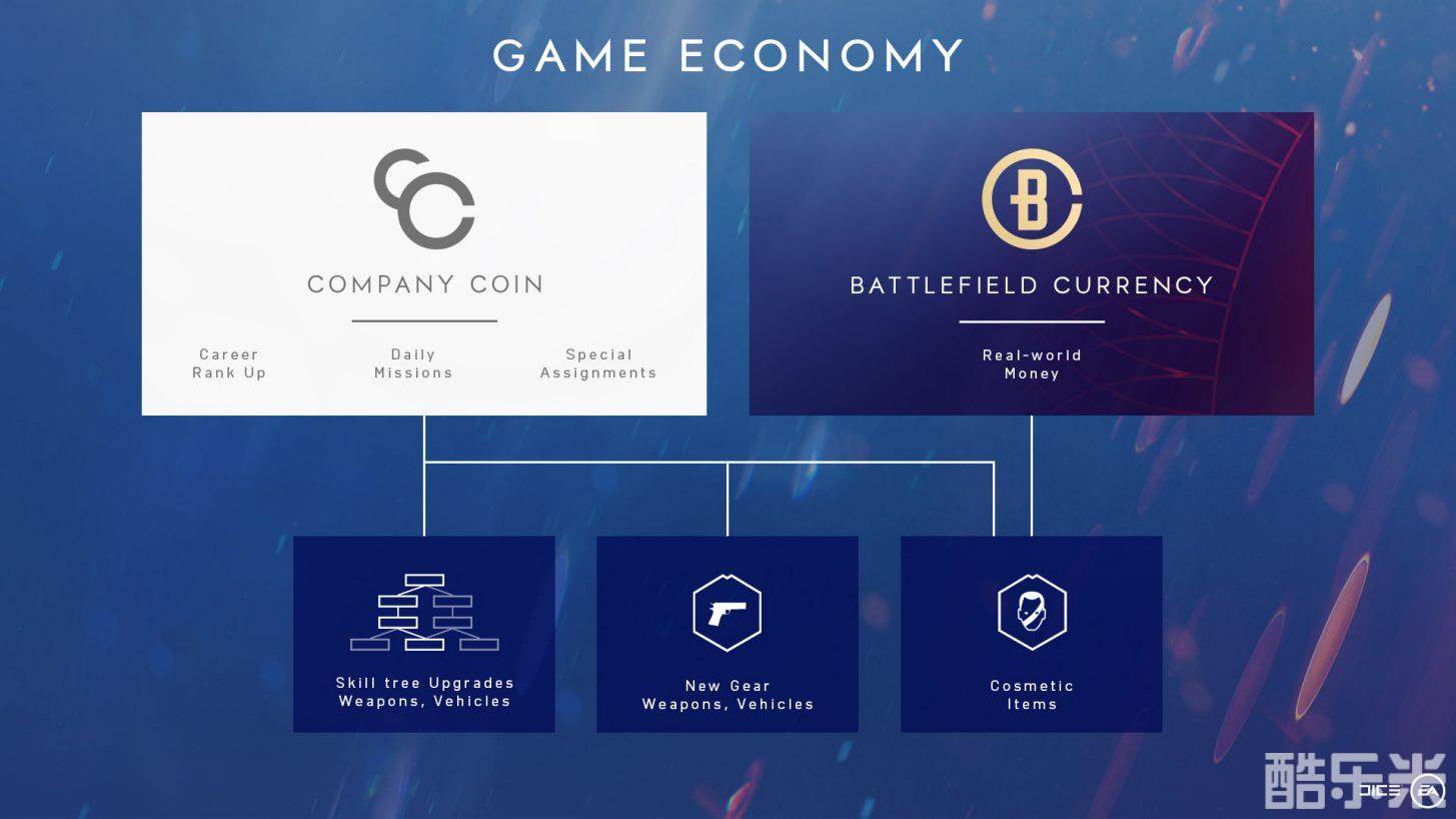 游戏中将会有两个货币:连队币和战地币。连队币可通过职业升级、每日任务以及特殊任务获得。而战地币则是一种高级货币,只能通过氪金花真钱购买。战地币可用来获得“特殊皮肤物品”,这应该是一些花真钱才能享受的皮肤装饰,不会影响游戏平衡。不过和《战地5》很多功能一样,首发时不支持战地币。