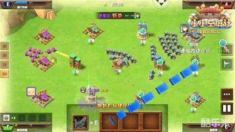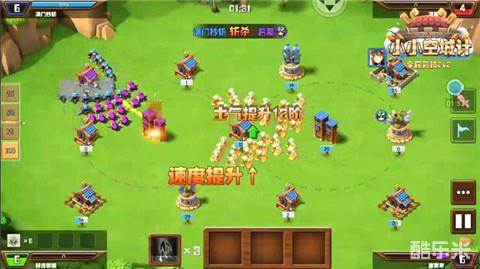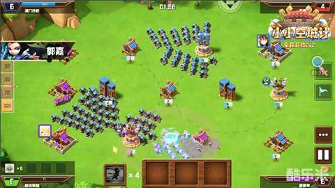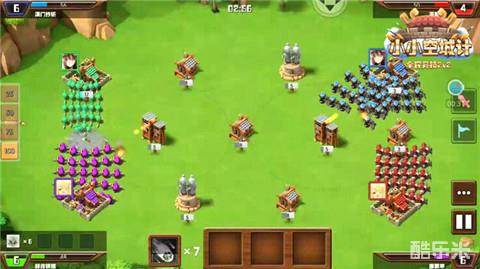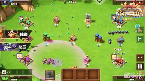 紫色方敌人与绿色方队友在相互的战斗间损耗了众多兵力,这时稳固图阵中的两个箭塔,占据有利地形,依次蚕食紫色方敌人的城池,消耗对手。此时再大军压上,对紫色方敌人的城池进行围攻,并用英雄技能消耗对手的兵力。