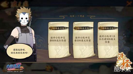 玩了三关后,出现了一个buff选择页面。这时候各位大大可以根据队内忍者的伤亡情况,选择buff!三种buff任你挑选,然后继续挑战!