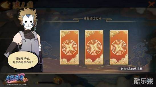 奖励的种类很多,包括:斩首大刀、雾隐飞针、秘术卷轴、雾隐暗部面具、风魔手里剑、雾隐苦无。当然,这些奖励不是通关后全都能拿到的,各位大大谨记,通关后翻牌,有机会获得其中一个奖励哦~(关卡不同,奖励的数量也会不同哒!)