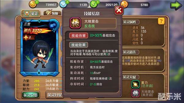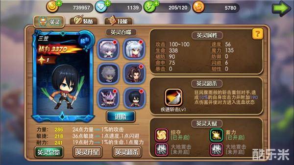 在动漫中,三笠以精准迅速并且杀伤力超强的斩击文明,游戏中亦是如此,三笠的超杀技能急速斩击可以通过狂风暴雨的斩击重创对手,造成伤害的同时并附加流血效果。三笠的四个英灵天赋分别是对蓄力、掠夺和大地震击的加强。强力的蓄力和掠夺技能使得三笠在战斗时可以不断通过超杀技能对敌人造成打击。而大地震击作为强力的反击技使三笠在与比自己攻速快的敌人战斗时不会因敌人接连不断的连击而落下风。三笠的自动技能建议使用冰封、迅兽击、掠夺或者迅兽击、血蝠、掠夺。冰封释放后会大幅度增强迅兽击的伤害,再配合掠夺和蓄力的怒气迅速积累,可以不断通过超杀技能进行杀伤。搭配迅兽击则更加强化进攻,爆发力更强。手动技能使用真视之眼,提高命中可以保证力耐型英雄输出的稳定性。剩下两个手动技能则根据对手情况选择搭配。被动技能使用蓄力、嗜血和天眼,天眼同样也是为提高命中而被选择。