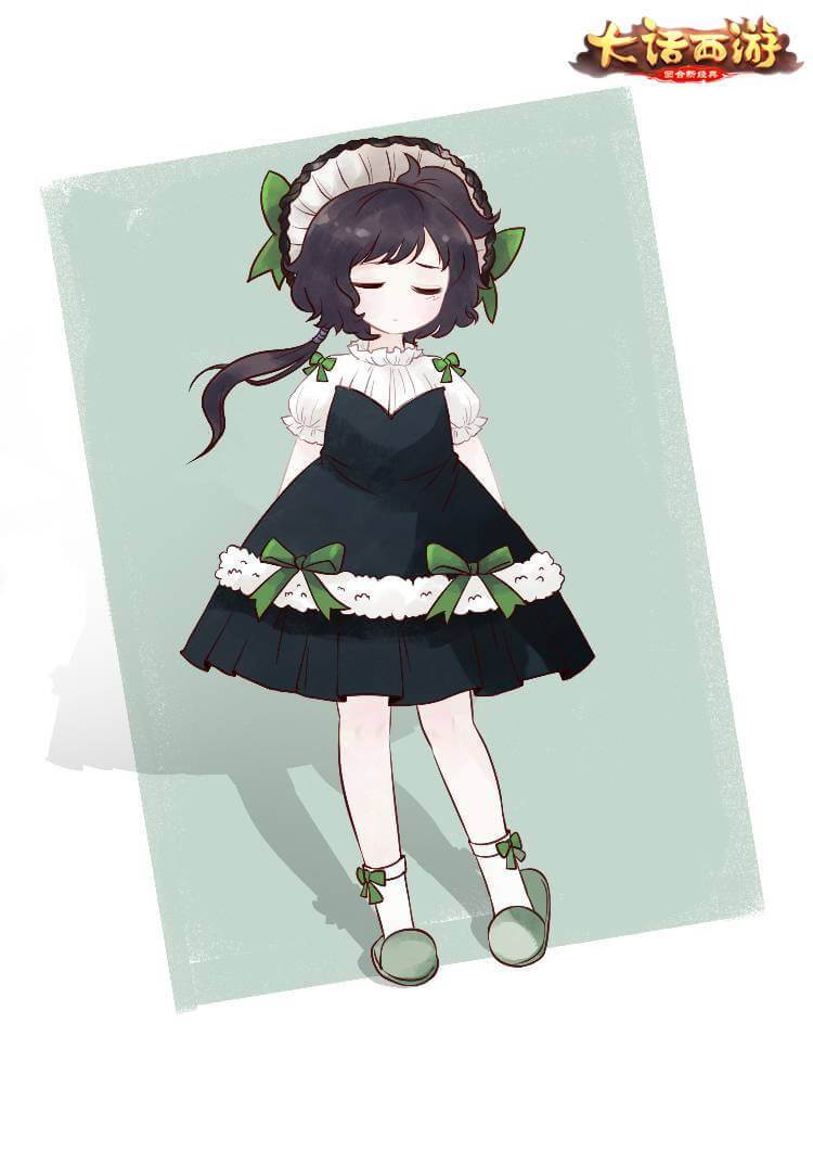 这款作品出自于“赤焰冲霄”服务器的裴空梦,飘逸的黑色裙摆缀以绿色的蝴蝶结,让服装整体看上去优雅而又乖巧,精致的礼帽与泡泡袖的设计,则彰显了洛丽塔风格所特有的可爱与华丽!