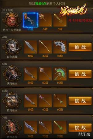 《战神破晓》野外BOSS太多人抢,正愁哪里打装备?个人BOSS是你最好的选择!每天在主界面右下角激战BOSS处,可以进入个人BOSS挑战,击败BOSS后,可获得强力装备!BOSS会在每日凌晨0点进行刷新,开通月卡更可以挑战丰富更奖励的月卡BOSS噢!