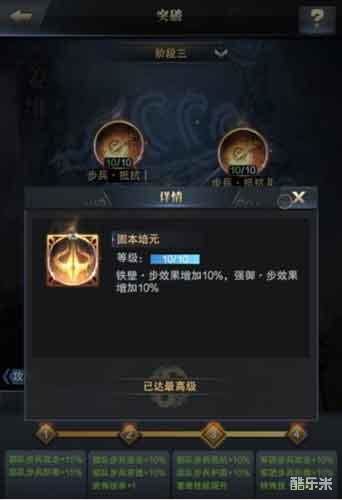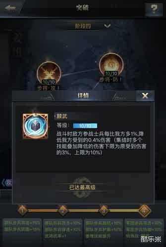 在姜维突破过程中,前三个阶段也主要是对于步兵的强化加成,如攻防加成、连击穿透加成、以及护盾抵抗加成等。而阶段三的“固本培元”是对姜维的个人技能进行强化,让姜维对部队步兵的防御力提升30%,军团步兵的防御力提升20%。对于抵御弓兵的攻击是非常有效的。在第四阶段的突破中,姜维能够为整个军团带来10%的步兵攻防加成。对于主修步兵的主公来说,姜维的各项加成还是非常强势的!