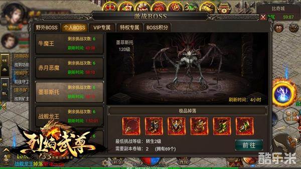 在《烈焰武尊》里想要快速打造一身极品装备,那么激斗BOSS无疑是最快的途径之一。激斗BOSS玩法主要分四大类,包括野外BOSS、个人BOSS、VIP专属和特权专属。其中野外BOSS和个人BOSS是相对常见的类型,且BOSS数量非常多,等级跨度广泛,适合所有玩家参与激斗。