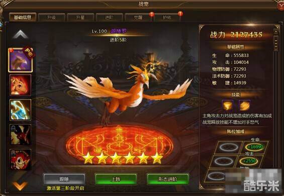 从紫色战宠迦楼罗也就是大家口中的火鸟说起,毕竟这是入门级的战宠嘛。先来展示下迦楼罗觉醒前的数值以及护佑的加成图: