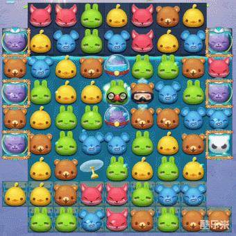 2、在抬升棋盘水位的同时,我们还要寻找机会,消除竹蜻蜓上升路线上的障碍物。由于棋盘中间有两个万能孵化器无法消除,我们在提升竹蜻蜓位置的同时,还需要尽量找机会将竹蜻蜓左移或右移1格,避免在中途被万能孵化器阻挡了上升路线。