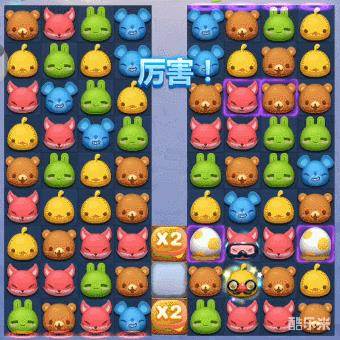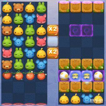 2、棋盘中间位置有2个翻倍汉堡,我们只要在翻倍汉堡旁边消除黄色棋子,就能让它们的收集数量翻倍。而如果能同时接触到2个翻倍汉堡,翻倍效果还能叠加,所以我们尽量靠近翻倍汉堡匹配消除,寻找机会翻倍黄色棋子的收集数量。