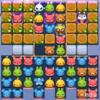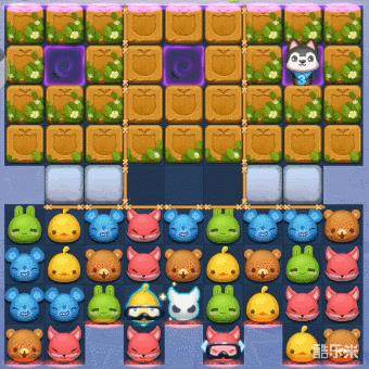 3、棋盘上方区域,又被栅栏阻隔成了左中右3块小区域,其中左右小区域内的木箱非常难以消除。不过,棋盘上方有1只哈士奇,会每步随黑洞在左中右3块小区域内转换位置,只要消除指定数量与其自身颜色相同的棋子,就能触发其攻击周围木箱。所以我们只要注意哈士奇的位置进行激活,就能轻松的消除木箱通过关卡了。