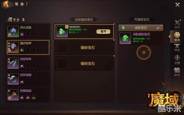 最后提醒大家一下,装备可镶嵌宝石的数量与装备的阶数有关!品阶越高,可镶嵌的宝石数量越高,一件装备最多可镶嵌5个宝石。所以在镶嵌时,尽量提升宝石等级,合理搭配宝石才能更好的提升实力。