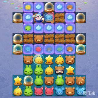 1、本关任务所需收集的星星,需要先打破星星罐才能生成在棋盘上。开局可以看到,星星罐大部份在棋盘上方的边缘位置。而棋盘上方有大量的障碍物,无法直接在棋盘上方进行匹配消除,且上方棋子无法掉落。所以我们首先需要消除气泡棋子,让棋盘水位上升,才能消除棋盘上方的障碍物和就近攻击星星罐。