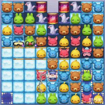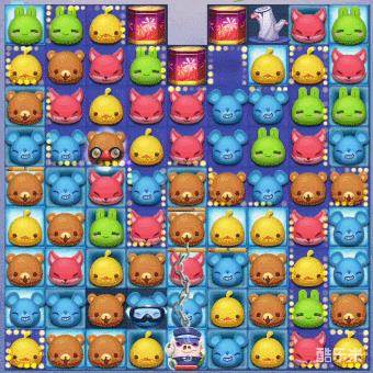 2、棋盘中有1只锁链猪,会每步移动锁住路径上的棋子,非常的影响我们匹配消除。由于其血量极多,消除非常的消耗步数,所以我们并不需要特地去消除它,只要在消除障碍物或燃放烟花时,顺带消除锁链或是击晕控制锁链猪即可。