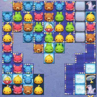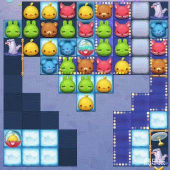 3、右下区域的空间较为狭小,匹配消除的机会并不多。如果没有匹配消除机会,我们可以尝试在棋盘左下角制造横向的目镜射线使用,或是攻击万能孵化蛋,孵化黄色棋子到右侧区域,均能改变右下角棋子布局,获得消除雪块的机会。