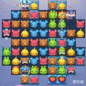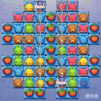 2、棋盘中的锁链猪,会每步移动位置并用链条困住路过的棋子,较为影响我们消除。锁链猪的消除非常消耗步数,而本关的步数恰恰不多。所以我们在消除冰块的同时,尽量顺带消除链条和击晕锁链猪,保持住一定的匹配消除空间即可。