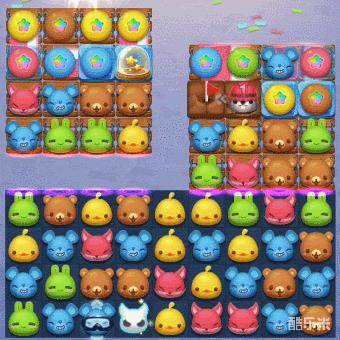 2、棋盘上方的冰块均有各种障碍物阻碍,我们想要消除冰块,必须先把障碍物消除。由于左上方的星星罐较难攻击到,而右上方的道路铺平又需要消耗大量步数。所以我们在下方区域消除冰块时,应当优先消除与土拨鼠帽子相同颜色的棋子,尽快将右上方的道路铺平。
