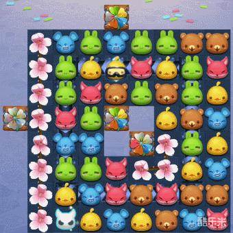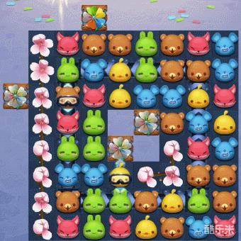 1、本关需要收集的五叶花,均在移动木桥上,不仅于棋子接触的方位不多,且均被樱花阻碍。所以我们开局最重要的是消除樱花,一方面扩大匹配消除空间,另一方面获得给五叶花花瓣染色的机会。由于一根枝条上的樱花,只要消除其中一朵就能全部消除,我们在消除时还需注意集中攻击一个位置的樱花。