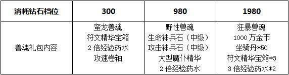 活动时间内累计消耗钻石数量达300、980、1980,即可获得兽魂礼包(可叠加领取)
