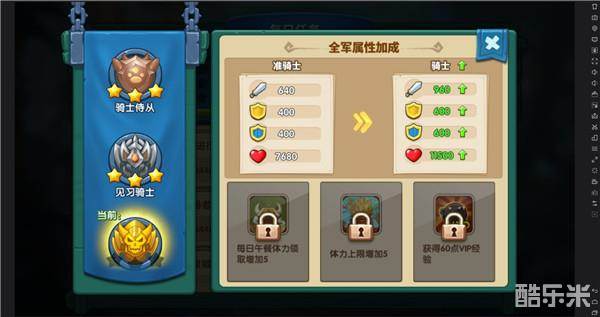 活跃头衔共有12个等级:骑士随从、见习骑士、准骑士、骑士、初级骑士、中级骑士、高级骑士、白银骑士、黄金骑士、殿堂骑士、圣骑士和传奇骑士。收集活跃经验点亮星星,集齐三颗星星后即可升级到下一级。每升级一次都能增加全军属性,还能提高每日三次体力领取数量、体力上限和增加VIP经验。