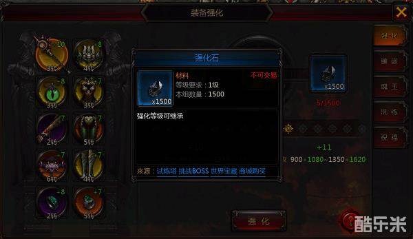 锻造—已穿戴的装备可以进行锻造强化提升属性,每件装备最多可以强化十五次,强化需要大量的强化石,强化石可以通过试练塔、boss副本、世界宝藏处等途径可以获得,追求战力最大化的玩家也可以在商城购买。