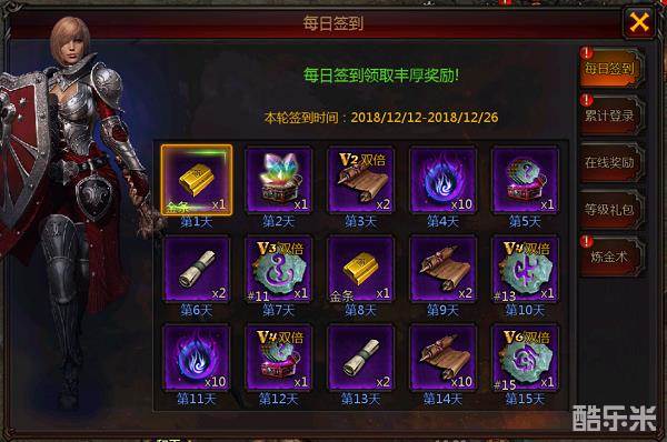 登陆游戏后,在游戏介面上方,点击“福利”,然后找到“每日签到”,即可领取对应的礼品。漏签一两天也不要紧,玩家可以花费钻石补领。而且在部分天数的签到,有达到vip要求的,还可以双倍领取。