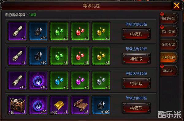 随着你等级提升,你就能开启专属与你的等级福利,除了金币和各种材料,最重要的还有转职神装送,让你成神之路更加平坦。
