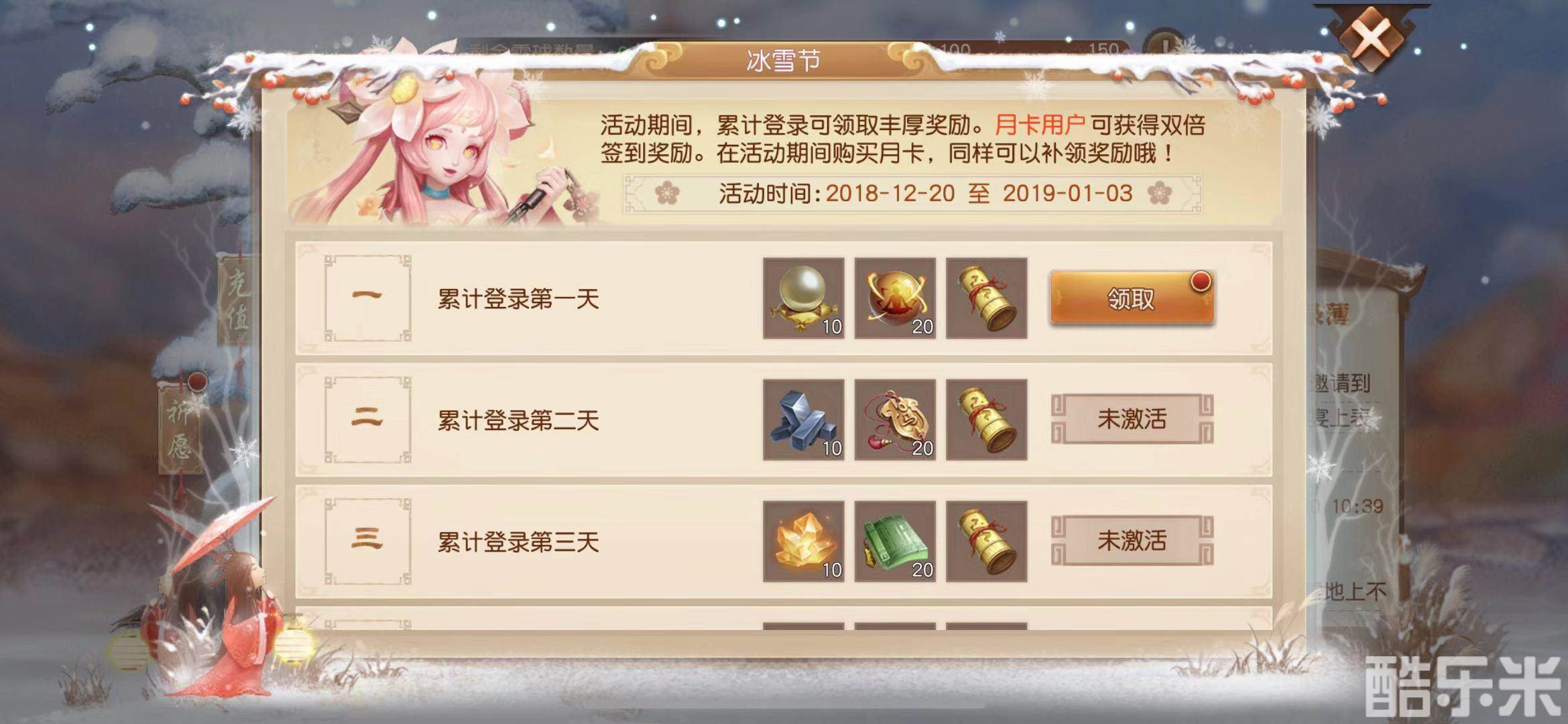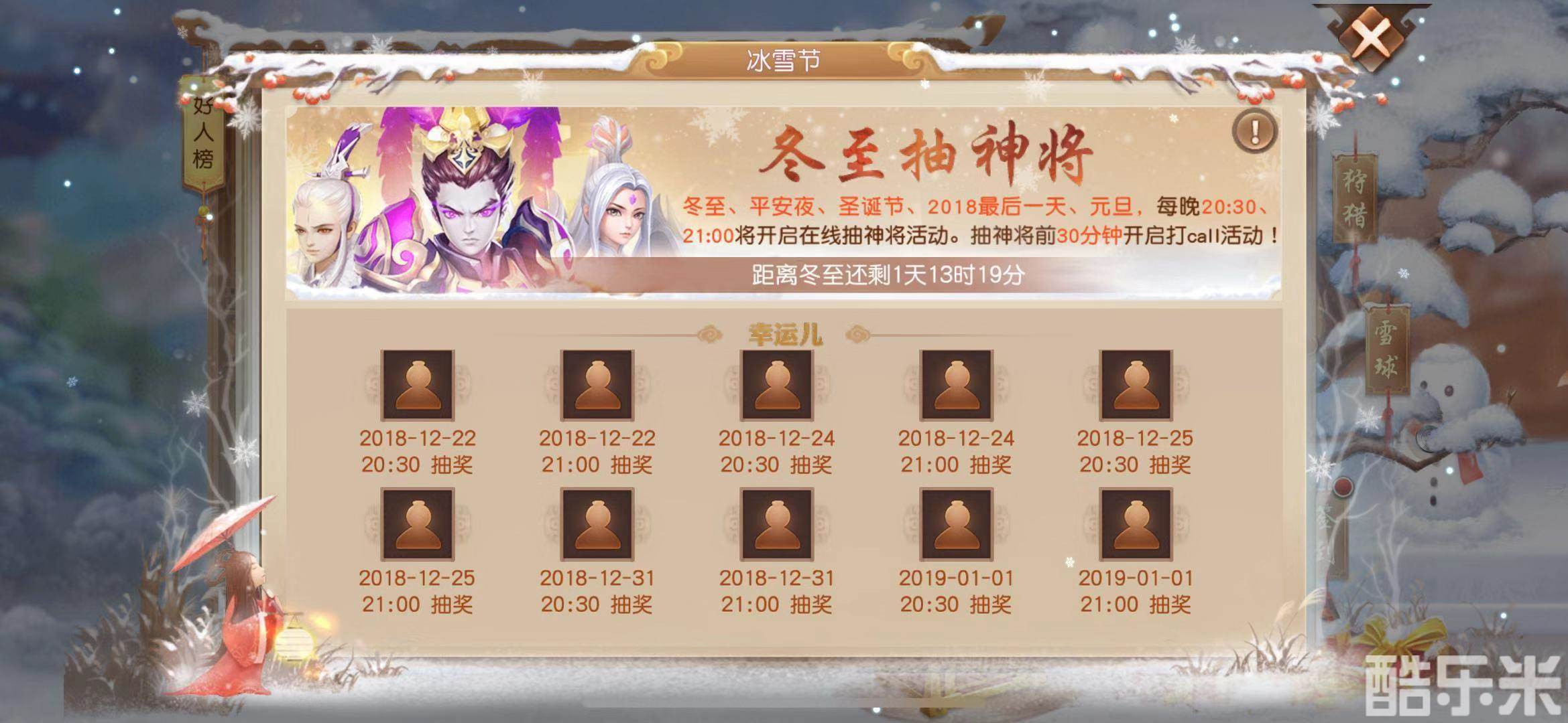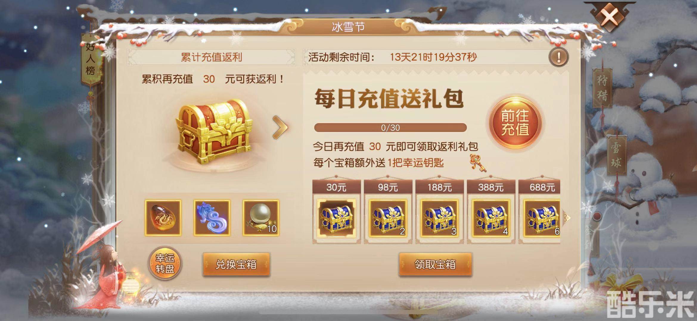 在冰雪盛典期间,主公每日充值达到一定额度,即可获得包括离火赤牛、引魂笛、木牛流马升级图纸、冰雪盛典头像框、神将爵印宝盒、普天同庆令等强力道具,此外,更有大量内含丰富道具的冰雪宝箱。每个冰雪宝箱还加送1把幸运钥匙,让主公可以从幸运转盘上抽取随机神将、木牛流马、乾坤风火轮、引魂笛、元宝在内的丰厚奖励。其中被财神选中的幸运儿还将获得财神祝福,赢得双倍元宝和道具奖励!
